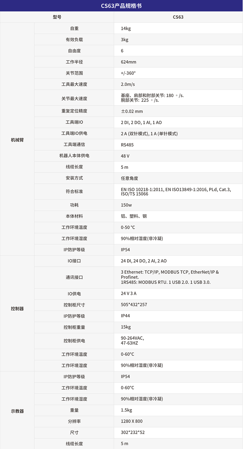 CS63具有小而強大的特點,它的有效載荷為3公斤,工作半徑為624mm。所有腕關(guān)節(jié)可以進(jìn)行360度旋轉(zhuǎn),末端關(guān)節(jié)可以無限旋轉(zhuǎn)。作為桌面式協(xié)作機器人,它可以輕松處理高精度任務(wù)和輕型裝配任務(wù)。