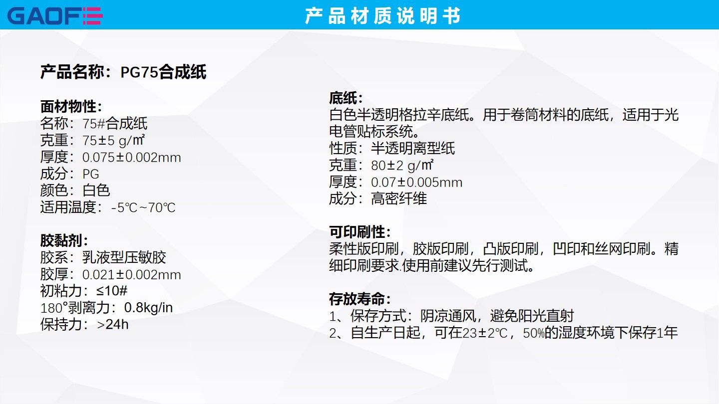 產(chǎn)品名稱:PG75合成紙