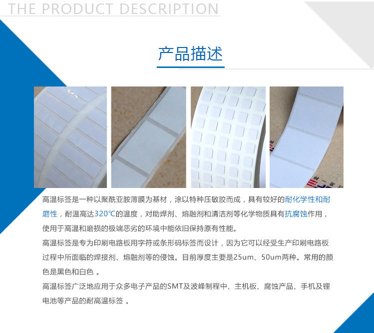 高溫標(biāo)簽聚酰亞胺薄膜為基材,涂以特種壓敏膠而成,具有較好的耐化學(xué)性和耐磨性,耐溫范圍200℃~600℃,對(duì)助焊劑、熔融劑和清潔劑等化學(xué)物質(zhì)具有抗腐蝕作用,使用于高溫和磨損的極端惡劣的環(huán)境中能保持原本性能。它是專為印刷電路板用字符或條形碼標(biāo)簽而設(shè)計(jì),因?yàn)樗梢越?jīng)受生產(chǎn)印刷電路板過(guò)程中所面臨的焊接劑、熔融劑等的侵蝕。目前厚度主要是25um、50um兩種。常用的顏色是黑色和白色 。高溫標(biāo)簽廣泛地應(yīng)用于眾多電子產(chǎn)品的SMT及波峰制程中、主機(jī)板、腐蝕產(chǎn)品、手機(jī)及鋰電池等產(chǎn)品的PCB板高溫標(biāo)簽。