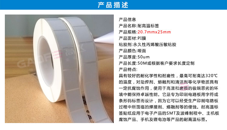 PCB板高溫標(biāo)簽聚酰亞胺薄膜為基材,涂以特種壓敏膠而成,具有較好的耐化學(xué)性和耐磨性,耐溫范圍200℃~600℃,對(duì)助焊劑、熔融劑和清潔劑等化學(xué)物質(zhì)具有抗腐蝕作用,使用于高溫和磨損的極端惡劣的環(huán)境中能保持原本性能。它是專為印刷電路板用字符或條形碼標(biāo)簽而設(shè)計(jì),因?yàn)樗梢越?jīng)受生產(chǎn)印刷電路板過(guò)程中所面臨的焊接劑、熔融劑等的侵蝕。目前厚度主要是25um、50um兩種。常用的顏色是黑色和白色 。PCB板高溫標(biāo)簽廣泛地應(yīng)用于眾多電子產(chǎn)品的SMT及波峰制程中、主機(jī)板、腐蝕產(chǎn)品、手機(jī)及鋰電池等產(chǎn)品的PCB板高溫標(biāo)簽。