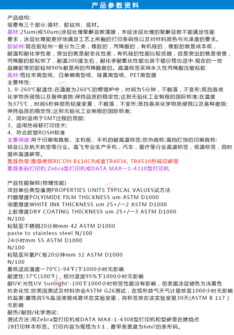 基材:25um(或50um)涂層處理聚酞亞胺薄膜,未經(jīng)涂層處理的聚酞亞胺不能滿足性能要求、涂層處理能更加地滿足工藝上所需的打印條碼性以及對(duì)材料顏色與光澤度的要求。