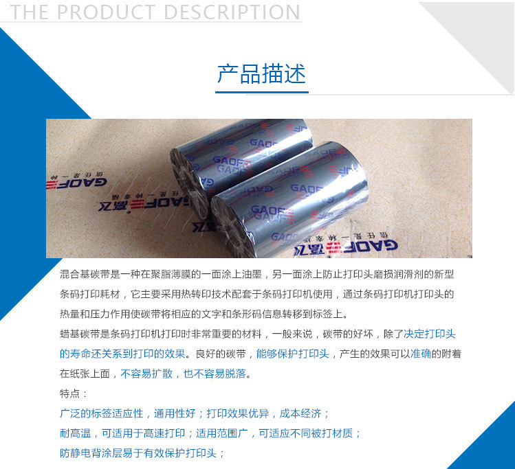 混合基碳帶品質(zhì)高、高速打印性能,優(yōu)異的耐磨擦、耐熱、耐腐蝕、耐久性能,耐磨能滿足各種苛刻環(huán)境要求,高敏感度,確保優(yōu)異的圖像打印效果,防靜電背涂層,有效保護(hù)打印頭。