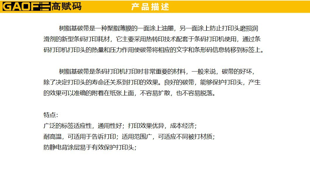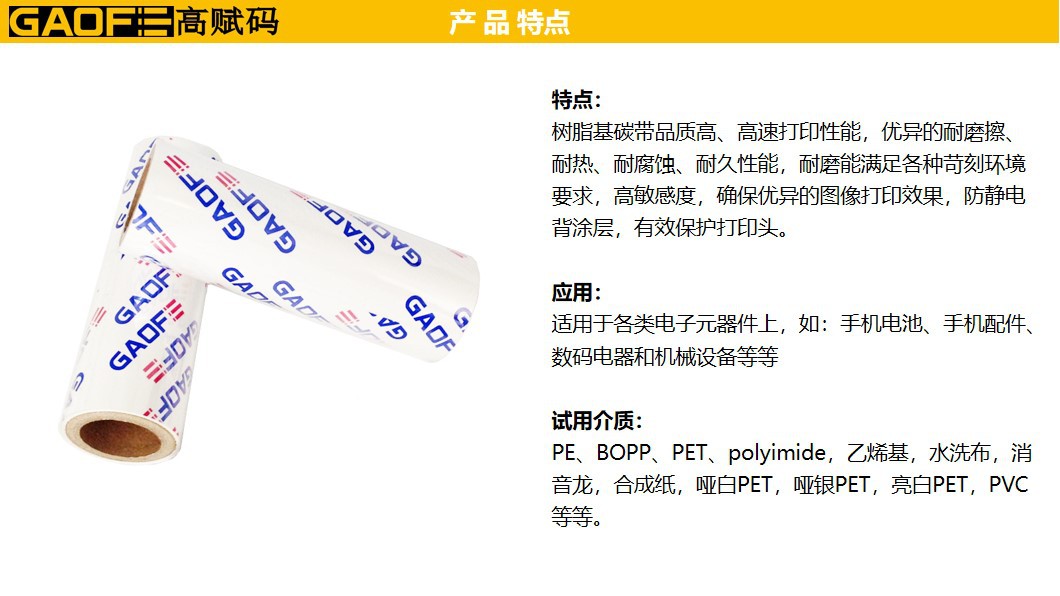 樹脂基碳帶品質(zhì)高、高速打印性能,優(yōu)異的耐磨擦、耐熱、耐腐蝕、耐久性能,耐磨能滿足各種苛刻環(huán)境要求,高敏感度,確保優(yōu)異的圖像打印效果,防靜電背涂層,有效保護(hù)打印頭。