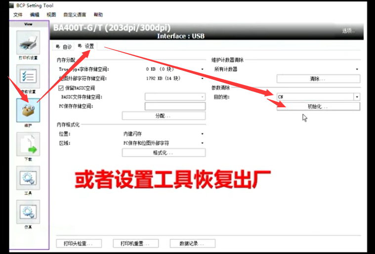 打開BCP Setting TOOL軟件——維護——設(shè)置——目的地選擇CN——點初始化——點確認(rèn)——等待恢復(fù)出廠設(shè)置完成。