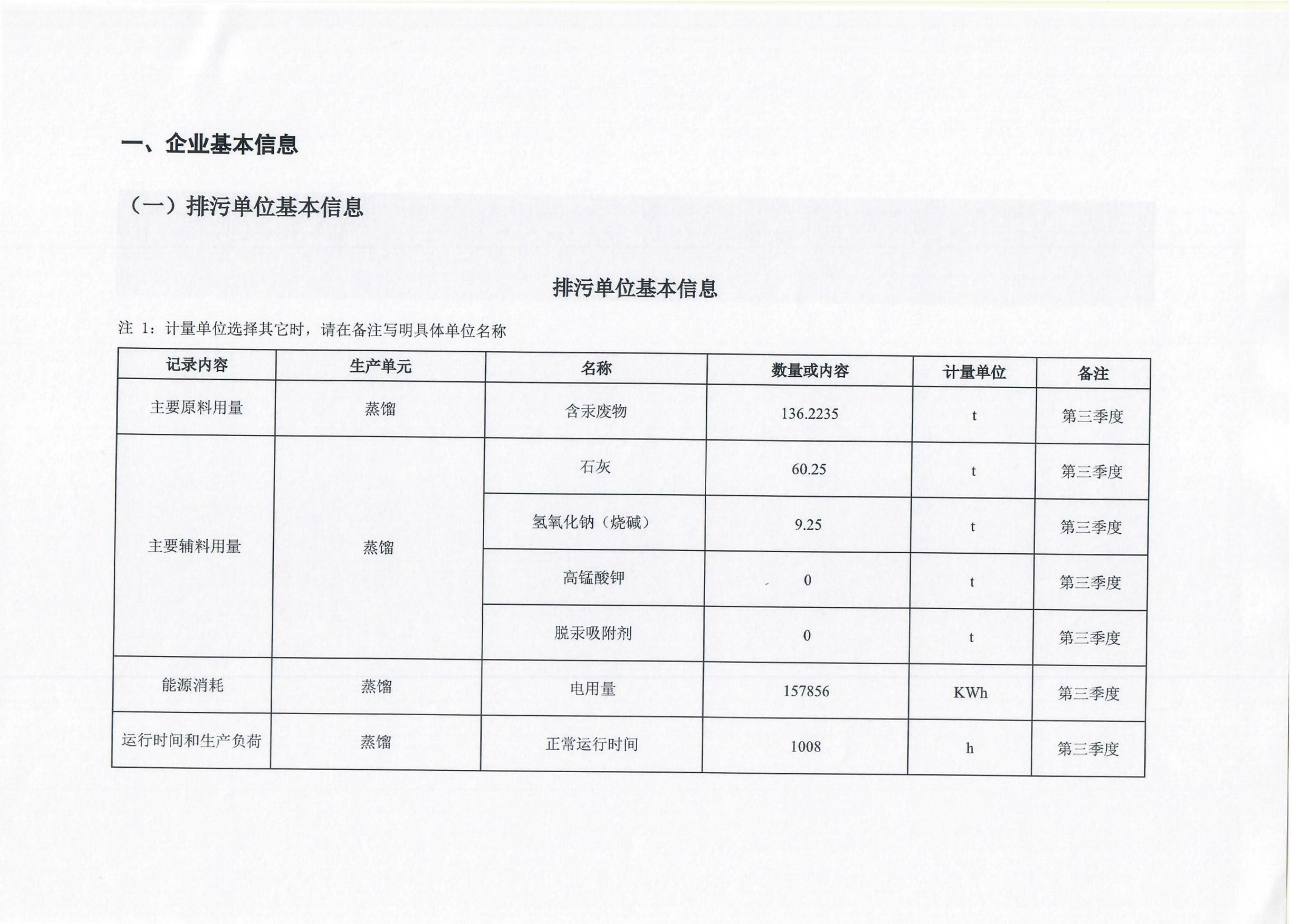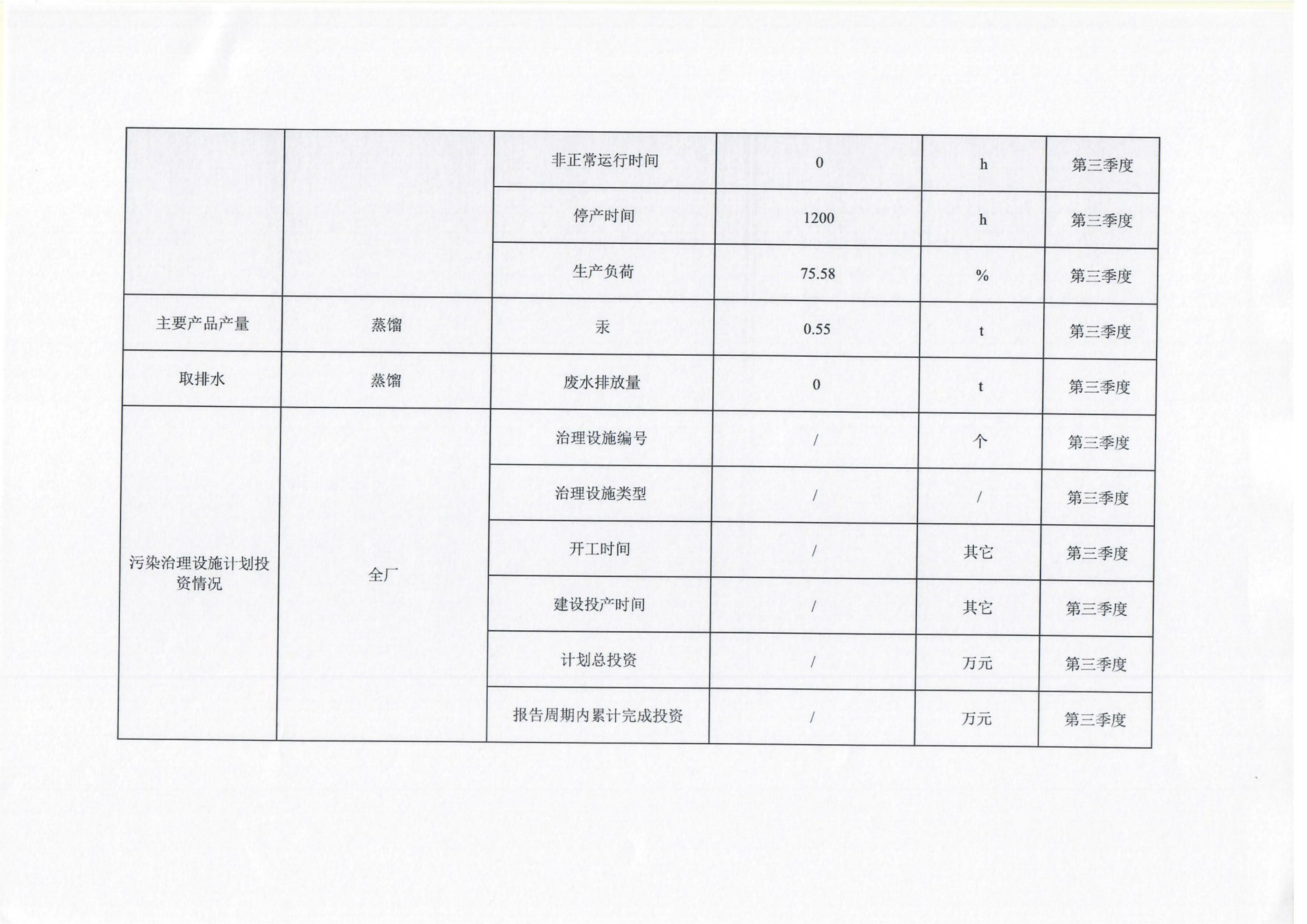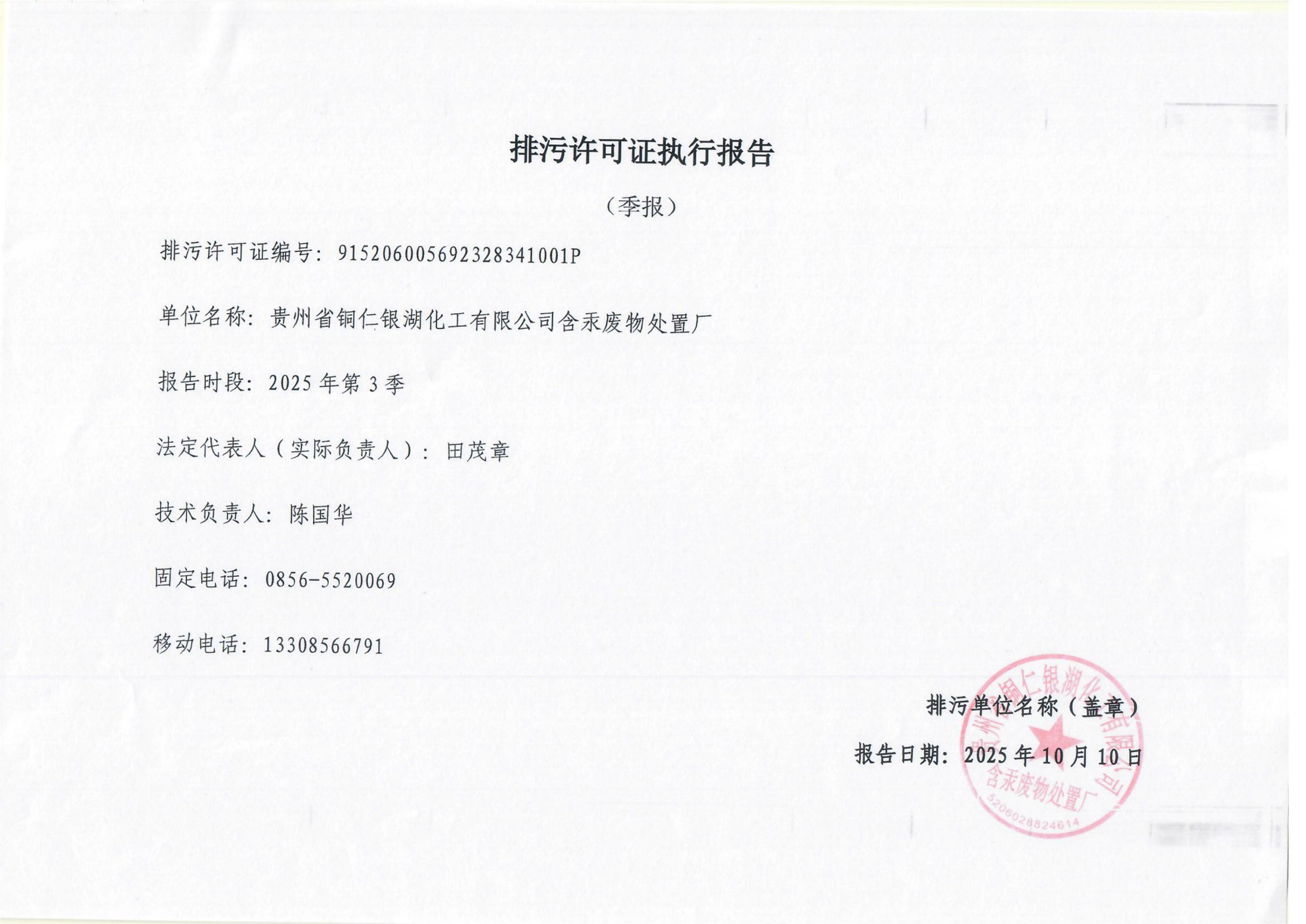 貴州省銅仁銀湖化工有限公司含汞廢物處置廠第三季度排污許可證執行報告
